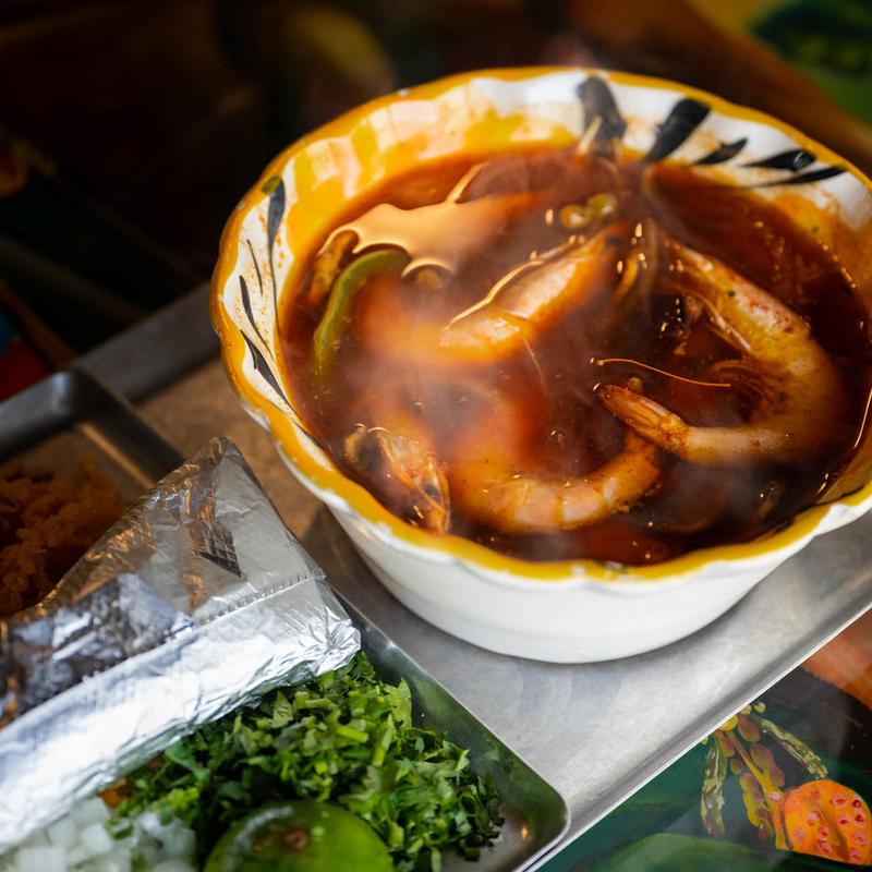 Hot soup containing shrimp and seafood mix. Served with cilantro, onions, and tostadas