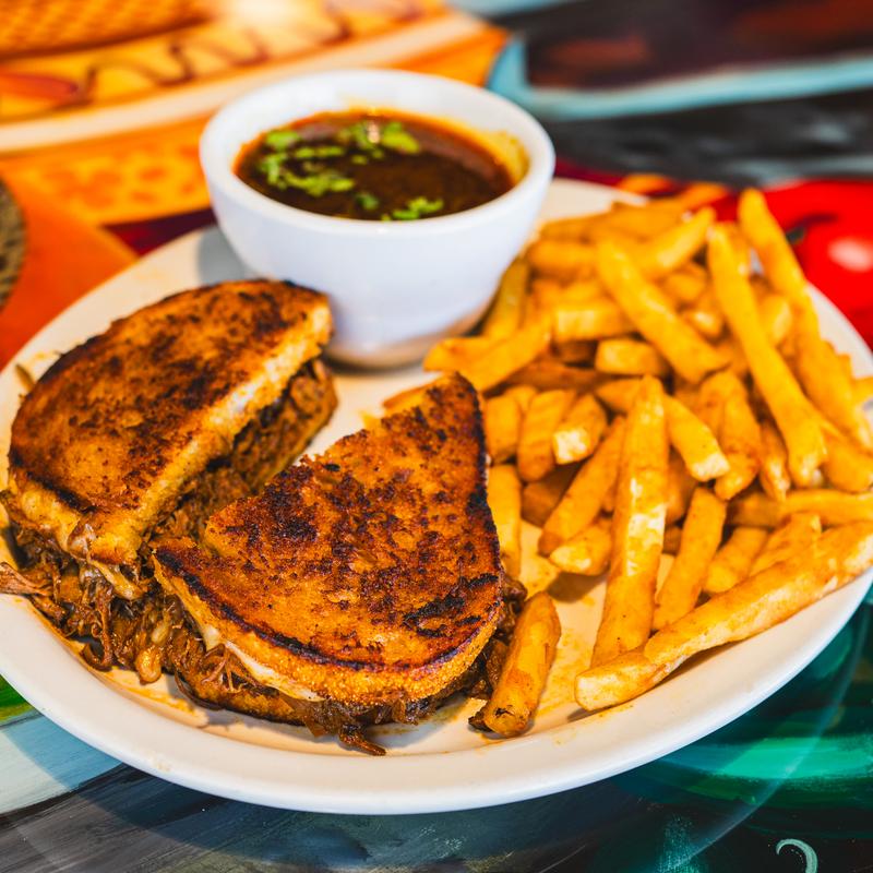 Birria sandwich on sourdough bread with our cheese blend. Served with fries and consomme